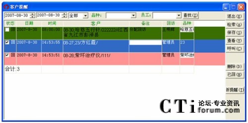 對于已經(jīng)回訪過的提醒,選定它并單擊已回,這樣它的狀態(tài)就會標記為已回,再單擊一下查找,則剛才設(shè)定為已回的提醒,記錄的顏色變?yōu)榉奂t。