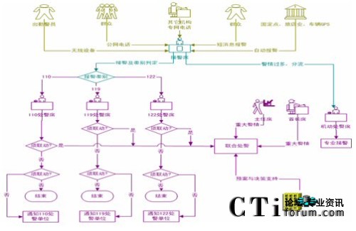 公安指揮綜合管理系統(tǒng)針對公安接處警的工作流程為:報警接收、報警識別、指揮調度、派警發(fā)送、處警記錄、全過程語音文本信息監(jiān)督、統(tǒng)計分析。指揮調度中又包括預案編制調用、有無線通信調度、實時監(jiān)控信息接收。系統(tǒng)工作流程如下圖所示: