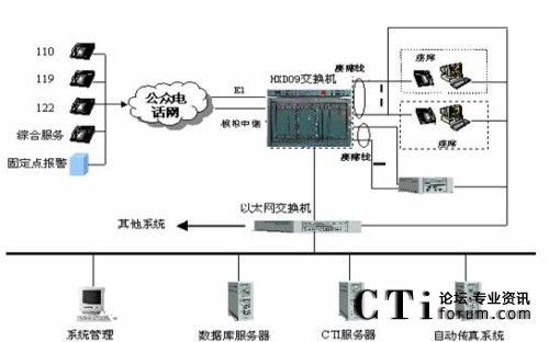 綜合接警平臺主要由hxd09可編程智能語音交換機和計算機網(wǎng)絡(luò)兩部分組成,交換機負(fù)責(zé)110、119、122報警電話的接入與分流及調(diào)度呼出等功能;計算機網(wǎng)絡(luò)則完成110、119、122報警信息的顯示、數(shù)據(jù)儲存、統(tǒng)計及信息查詢、發(fā)布功能。