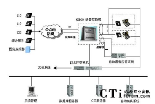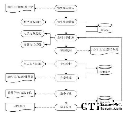 該系統(tǒng)主要分為電信子系統(tǒng)(完成聯(lián)動(dòng)中心與各電信公司之間話音的傳輸、交換和分配,以及主叫號(hào)碼和主叫地址的自動(dòng)查詢和傳輸?shù)龋、接警中心子系統(tǒng)(統(tǒng)一接聽(tīng)和處理市民的報(bào)警、求助電話)、指揮調(diào)度子系統(tǒng)(或稱(chēng)為處警中心,通過(guò)直觀的地理信息系統(tǒng)和數(shù)據(jù)庫(kù),可以對(duì)所有的資源和警力分布了如指掌。通過(guò)一體化的無(wú)線數(shù)據(jù)傳輸和無(wú)線調(diào)度臺(tái)進(jìn)行方便的統(tǒng)一管理,指揮和調(diào)度)、信息網(wǎng)絡(luò)子系統(tǒng)(聯(lián)動(dòng)中心的骨干網(wǎng)絡(luò),把各種數(shù)據(jù)數(shù)庫(kù)、接處警席位、移動(dòng)的警用車(chē)載計(jì)算機(jī)等互聯(lián)在一起,形成一個(gè)強(qiáng)大的信息網(wǎng)絡(luò))、無(wú)線指揮調(diào)度通信子系統(tǒng)、大屏幕顯示子系統(tǒng)、地理信息子系統(tǒng)、GPS/GIS子系統(tǒng)。