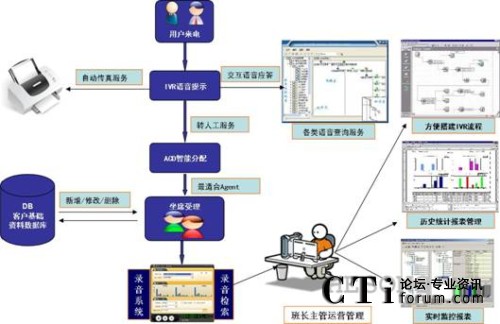 用戶電話呼入時,系統(tǒng)通過自動語音應(yīng)答的方式,實現(xiàn)用戶服務(wù)的自動導航。交互式語音應(yīng)答功能自動播放問候和語音提示信息,根據(jù)用戶按鍵選擇提供自助服務(wù)或者呼叫中心人工服務(wù)。呼叫中心提供人工服務(wù)后還可以為特定的用戶需求提供人工轉(zhuǎn)IVR自動語音服務(wù),比如114查詢到電話、地址后,電信10000號呼叫中心提供的語音播放服務(wù)。
