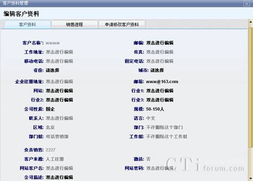 點(diǎn)擊標(biāo)簽選擇要查看的客戶資料,和銷售進(jìn)程。查看客戶日志能看到該客戶被執(zhí)行操作的歷史情況,例如資料的變更,所屬的變更等等。添加聯(lián)系人是指為當(dāng)前客戶添加新的聯(lián)系人,添加完聯(lián)系人信息后,聯(lián)系人就會(huì)被納入到該客戶資料里。