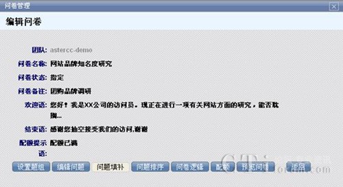 在這里你可以對(duì)問卷設(shè)置題組、編輯問題、補(bǔ)充問題、問題排序、問卷邏輯、配額、預(yù)覽問卷同時(shí)進(jìn)行操作,一步到位。