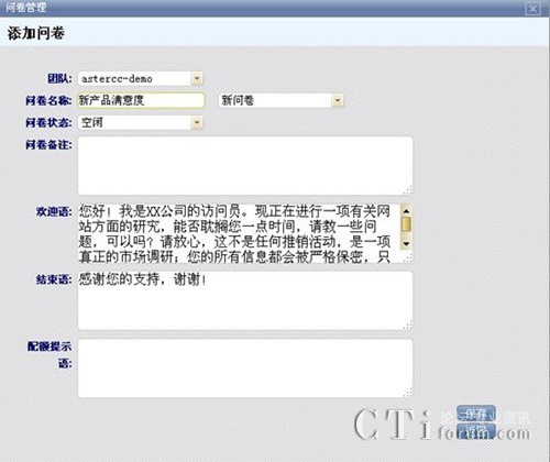 添加功能用來添加新問卷,這里你可以根據(jù)業(yè)務(wù)的需要設(shè)定所需要得信息,例如問卷的歡迎語(yǔ),結(jié)束語(yǔ),配額提示語(yǔ)等信息,自定義輸入信息。
