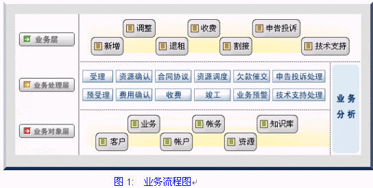 網(wǎng)通一站服務(wù)業(yè)務(wù)系統(tǒng):實現(xiàn)業(yè)務(wù)受理、資源確認(rèn)、費用確認(rèn)、合同/協(xié)議、收費、資源調(diào)度、竣工、業(yè)務(wù)預(yù)警、申告投訴處理、技術(shù)支持處理功能。其業(yè)務(wù)流程如下圖: