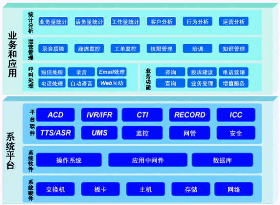 是呼叫中心的基礎,實現了具體服務電話的接入和處理,由硬件設備、系統軟件和平臺軟件構成。