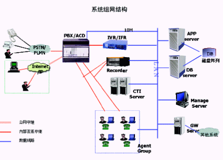 針對大型呼叫中心需求,可以推薦采用傳統PBX平臺呼叫中心解決方案;鞠到y組網結構如下: