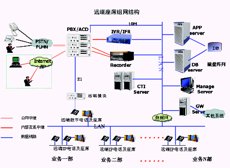 遠端座席組網方式中,中心點和遠端座席之間通過采用數字中繼(E1)連接的遠端模塊或采用數據網絡連接的IP電話方式。具體方式如下圖: