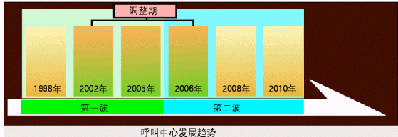 在合力金橋軟件公司的副總裁盧毅看來(lái),1998年以前是呼叫中心在中國(guó)市場(chǎng)的導(dǎo)入期,1998~2005年第一波呼叫中心的建設(shè)期,直接促成了整個(gè)市場(chǎng)的擴(kuò)大和呼叫中心座席數(shù)的大幅增加;在2006年~2010年,由于受到中國(guó)加入WTO、2008年北京舉辦奧運(yùn)會(huì)、2010年上海舉辦世界博覽會(huì)等社會(huì)政治、經(jīng)濟(jì)事件的推動(dòng),將會(huì)出現(xiàn)第二波的呼叫中心建設(shè)風(fēng)潮;而從2002年~2006年中期是個(gè)調(diào)整期,第一波的呼叫中心建設(shè)此時(shí)進(jìn)入運(yùn)營(yíng)期和消化期,同時(shí)為第二波的建設(shè)應(yīng)用積蓄力量。