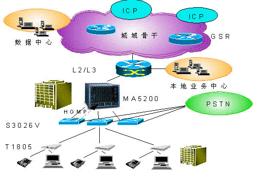 在用戶接入層Quidway S3026V提供24路VDSL接入,在普通雙絞線上提供12Mbps的雙向?qū)ΨQ數(shù)據(jù)業(yè)務(wù),傳輸距離最大可達(dá)1500m,在完成以太網(wǎng)接入的同時,不影響POTS業(yè)務(wù)。S3026V上行FE接口直接接入L3交換機。同時,通過雙絞用戶線完成了與PSTN交換機的相連,將寬帶、窄帶業(yè)務(wù)在S3026V上匯合,并通過已有雙絞電話線連接至遠(yuǎn)端用戶設(shè)備(1805)。1805可以通過五類線與計算機網(wǎng)卡相連。