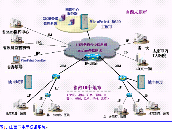 8000綜合視訊系統(tǒng),主會(huì)場(chǎng)設(shè)在非典防治指揮中心,利用現(xiàn)有的山西黨政公眾信息網(wǎng)絡(luò)及通信部門(mén)緊急支援的2Mbps數(shù)據(jù)專線,整個(gè)系統(tǒng)采用H.323協(xié)議,在省內(nèi)7大醫(yī)院、及省政府有關(guān)部門(mén)使用ViewPoint