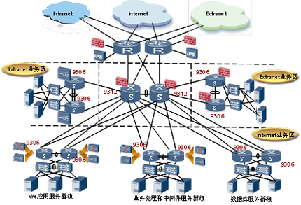 根據(jù)業(yè)務(wù)需要,在不同分區(qū)的匯聚交換機(S9306)上合理部署負(fù)載均衡和防火墻單板,來有效支撐相應(yīng)的服務(wù)器群的業(yè)務(wù)展開需要;在核心的匯聚交換機(S9312)上也配置防火墻單板為不同的功能分區(qū)間的流量進(jìn)行有效控制。