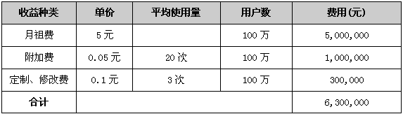根據(jù)以上所述,假如用戶數(shù)為100萬,CRBT月租費(fèi)為5元,并提供20次的免費(fèi)呼叫,之上每次呼叫收取0.05元假若每月附加呼叫為平均20次,即每月用戶平均收到40次呼叫。且每用戶每月至少定制或修改三條CRBT,每次收費(fèi)0.1元。