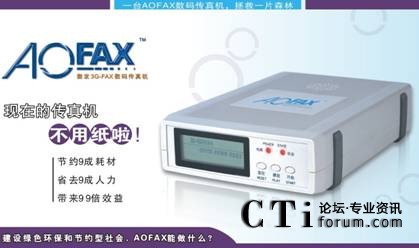 CTI論壇(ctiforum)10月20日消息(記者 潘婷婷):傳真機(jī)自1906年發(fā)明以來(lái),到今天已走過一百多年的歷史,傳真的形式也從最早的機(jī)械傳真機(jī)、光電傳真機(jī)、數(shù)字傳真機(jī)發(fā)展到今天的電子傳真、電腦傳真、網(wǎng)絡(luò)傳真、無(wú)紙傳真、傳真軟件、傳真系統(tǒng)、傳真服務(wù)器等。其中,由金恒科技(深圳)有限公司推出的傲發(fā)3G-FAX電子傳真系列產(chǎn)品(AOFAX),是新一代傳真的典范,引領(lǐng)著未來(lái)傳真發(fā)展的方向。