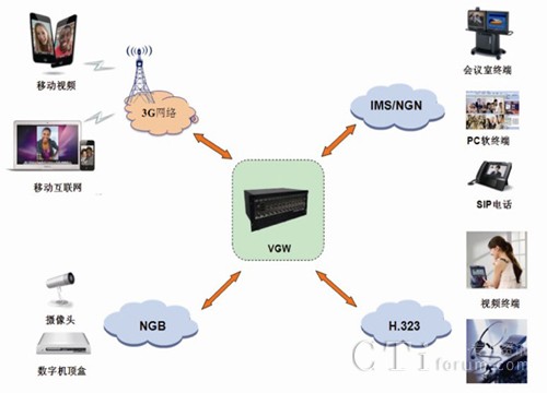 艾諾通信 NetFidelityTM系列視頻網(wǎng)關(guān)VGW應(yīng)用于3G、IMS、NGB等異構(gòu)網(wǎng)絡(luò)之間,提供信令互通和音視頻媒體轉(zhuǎn)換功能,實現(xiàn)移動終端、PC終端以及機(jī)頂盒“三屏”融合應(yīng)用。