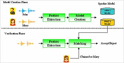 而語(yǔ)者驗(yàn)證(Speaker Verification)技術(shù),如下圖所示,我們亦可稱之為語(yǔ)者認(rèn)證(Speaker Authentication)或是語(yǔ)者偵測(cè)(Speaker Detection),主要是用來(lái)鑒定一已知身份的說(shuō)話者其宣稱之身份的真實(shí)性,利用擷取說(shuō)話者的聲紋特征,我們可以從事先儲(chǔ)存的語(yǔ)者聲紋資料庫(kù)中,取出該宣稱身份的語(yǔ)者聲紋模型,并且和說(shuō)話者輸入的聲音做比對(duì),由于系統(tǒng)會(huì)先獲知該使用者表明的身份(如小美),所以這會(huì)造成兩種可能的判斷錯(cuò)誤,其中一種是錯(cuò)誤接受(False Accept),即說(shuō)話者為一冒充者(Imposter)但被系統(tǒng)誤認(rèn)為其所宣稱的身份,另外一種是錯(cuò)誤拒絕(False Reject),即系統(tǒng)將真實(shí)身份的說(shuō)話者誤判為冒充者。
