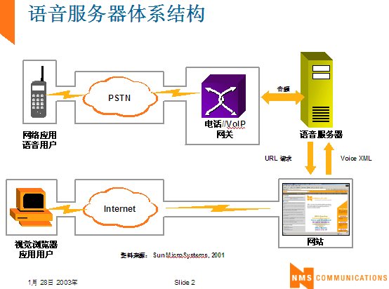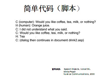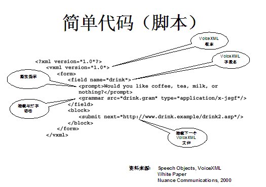 世界上最古老的用戶界面--人類語言終于在二十一世紀(jì)借助于VoiceXML,一種語音可擴展標(biāo)記語言發(fā)展成熟起來。作為世界上第一個真正的語音通信標(biāo)準(zhǔn),它定義了應(yīng)用開發(fā)商向用戶提供新型信息訪問服務(wù)的方式。通過這種服務(wù),用戶在任何地方,都可以通過電話或任何移動設(shè)備,虛擬訪問任何信息。VoiceXML正在被廣泛應(yīng)用于旅游、金融與信息服務(wù)等行業(yè)的各種業(yè)務(wù)領(lǐng)域中,甚至是政府部門與市政機構(gòu),全球的無線運營商等。