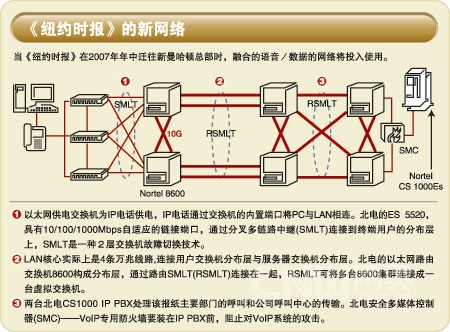 在離開(kāi)自1913年就堆滿紙張的43號(hào)大街總部的同時(shí),《紐約時(shí)報(bào)》也將離開(kāi)基于Avaya專用分組交換機(jī)和電話,以及Cisco交換機(jī)和路由器的傳統(tǒng)語(yǔ)音/數(shù)據(jù)網(wǎng)。新辦公大樓中的網(wǎng)絡(luò)從局域網(wǎng)到數(shù)據(jù)中心及內(nèi)網(wǎng)核心均采用北電的設(shè)備。《紐約時(shí)報(bào)》IT技術(shù)人員表示,由單廠商組建的網(wǎng)絡(luò)將為用戶提供更高的安全性、更容易的管理和更豐富的媒體功能。