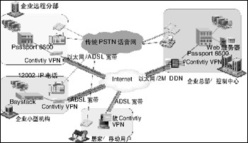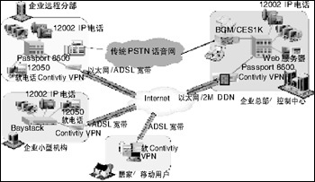 在企業(yè)網(wǎng)上加載北電網(wǎng)絡(luò)話音設(shè)備(BCM,CSE1K或ITG/M1),再配合上北電網(wǎng)絡(luò)的IP電話i2002/i2004,或在移動(dòng)用戶的PC上安裝i2050