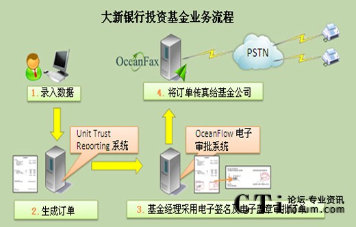 大新銀行Information Technology Division作出多方研究及比較,最終選定OceanX旗艦產品、市場增長第一并屢獲殊榮的OceanFax傳真服務器作為電子傳真工具;并與Unit Trust Reporting系統(tǒng)及OceanX另一旗艦產品OceanFlow電子審批系統(tǒng)整合,理順投資基金業(yè)務,實現(xiàn)自動流程,包括訂單生成、審批及傳真發(fā)送流程。