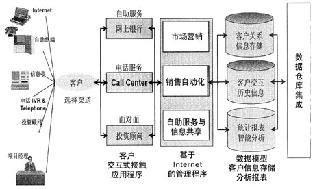 針對商業(yè)銀行面臨的挑戰(zhàn)和真實(shí)的需要,Oracle開發(fā)了面向銀行業(yè)的CRM解決方案。該解決方案提供全方位、統(tǒng)一的多渠道協(xié)同的客戶交互服務(wù)入口,包括網(wǎng)上自助服務(wù)、網(wǎng)上他助服務(wù)(通過Call Center在線指導(dǎo)客戶理財(cái)或提供投資建議)、電話自助服務(wù)、電話專家服務(wù)、電話智能市場推銷和銷售等。現(xiàn)場服務(wù)則提供客戶經(jīng)理與客戶面對面交流的能力,包括知識(shí)共享(金融市場信息、銀行產(chǎn)品信息和各業(yè)務(wù)部門發(fā)布的信息等)、銀行信息的及時(shí)獲取、產(chǎn)品和服務(wù)介紹、適時(shí)的投資建議、客戶交易行為追蹤、通過智能化工具提供專家服務(wù)、銷售機(jī)會(huì)管理等,允許重點(diǎn)客戶通過Web、電話或與客戶經(jīng)理/投資顧問面談等方式,提供更靈活的服務(wù)選擇和更及時(shí)的服務(wù),以保留大客戶群,增長股東利益。