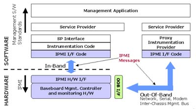 - 管理軟件:系統(tǒng)管理者最常接觸的就是上層的管理軟件,簡單的類型就是使用一般的終端機(Terminal)程序來接收從Serial/Modem所傳送過來的文字訊息。近年來,除了BMC廠商會有自行開發(fā)的上層管理軟件外,也有不少的軟件廠商加入了開發(fā)管理軟件的行列,而他們最主要利用的溝通界面即為網(wǎng)絡界面。不管是通過序列或是網(wǎng)絡,在界面上傳輸?shù)亩际荁MC所能辨認的IPMI訊息。