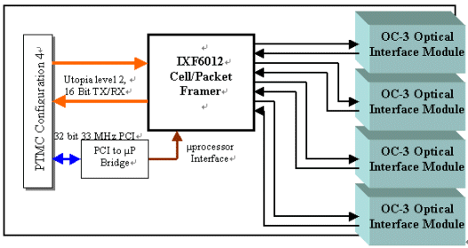 我們來看看下面PT4MC的區(qū)塊圖。這張圖提供了四個OC-3的界面,同時使用Utopia level 2來互相聯(lián)系網(wǎng)絡處理器。