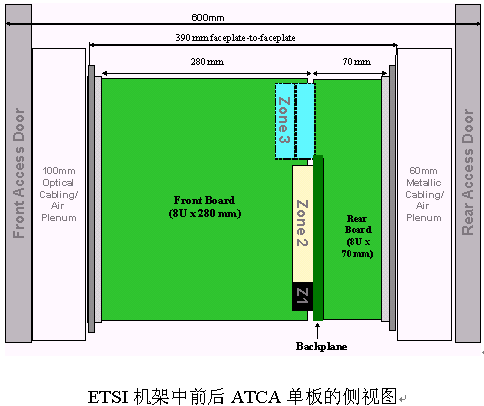 PICMG 3.0機(jī)構(gòu)要求主要來(lái)自于對(duì)600mm ETSI 和19" EIA標(biāo)準(zhǔn)機(jī)柜空間使用的研究。PICMG 3.0委員會(huì)在考慮單板尺寸能支持下一代元器件對(duì)物理和散熱的需求的同時(shí),機(jī)箱空間能和板子能達(dá)到最大限度的配合和利用。最初的工作是基于歐規(guī)卡的標(biāo)準(zhǔn),繼而又提升到支持低成本的片狀金屬架構(gòu)(簡(jiǎn)單電訊封裝)。對(duì)后走線模塊的支持滿足了對(duì)后I/O應(yīng)用的需求。在決定可以使用的單板空間時(shí),也充分考慮了前、后板的進(jìn)深范圍以供大量電纜束綁空間。經(jīng)過(guò)對(duì)不同規(guī)格尺寸的單板的優(yōu)點(diǎn)進(jìn)行討論之后,PICMG 3.0組織統(tǒng)一規(guī)格如下:前板 8U x 280mm,進(jìn)深1.2" pitch,選配后板8U x 70mm深。基于1.2" pitch,19" EIA機(jī)框可以支持14槽,而600mm ETSI的機(jī)框可以支持16槽。下圖所示為600mm ETSI機(jī)架中的ACTA前后單板的側(cè)視圖: