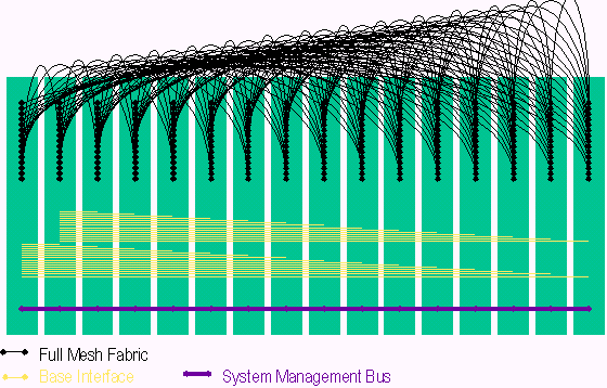 PICMG 3.0包含多種傳輸,這些傳輸模式如圖由下而上依序提供系統(tǒng)管理層、控制層、資料層等的聯(lián)接。系統(tǒng)管理是基于一條與各槽位都相連的I2C 雙串行信號(hào)線, 系統(tǒng)管理信息則是基于IPMI規(guī)范被擴(kuò)展到在PICMG3.0規(guī)范中使用。系統(tǒng)管理總線也是冗余方式確保在一條總線故障情況下,管理信息仍正常傳遞。在資料層旁邊的控制層稱(chēng)作Base 接口 (Base Interface),Base接口是一個(gè)雙星型的拓?fù)浣Y(jié)構(gòu)具有冗余的交換刀片和以太網(wǎng)BAST-T信號(hào),在PICMG 3.0中提供IP傳輸,這點(diǎn)在架構(gòu)定義上非常像PICMG 2.16。PICMG 3.0單板的高速數(shù)據(jù)傳輸是通過(guò)Fabric接口 (Fabric Interface),F(xiàn)abric接口是基于3.125Gbps SERDES信號(hào),可以在星型和全網(wǎng)狀結(jié)構(gòu)中支持10Gb的傳輸速率。正如上面提到的,PICMG 3.0核心規(guī)范定義了Fabric接口的信號(hào)和互聯(lián),而輔助規(guī)范定義了用于傳輸?shù)膮f(xié)議。PICMG 3.0 背板的互聯(lián)支持全網(wǎng)狀Fabric接口,雙星型Base接口和冗余的系統(tǒng)管理,如下圖所示: