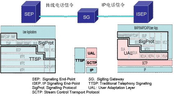 圖中粉紅色部分為SIGTRAN的協(xié)議棧,在它們之上的是對(duì)應(yīng)的電話信令協(xié)議。SIGTRAN的協(xié)議棧分為2層:一層是SCTP,它提供多個(gè)流的,可靠的數(shù)據(jù)傳輸,用戶數(shù)據(jù)的捆綁和分段,阻塞和流量控制,防止"拒絕服務(wù)"和"偽裝"的攻擊等功能。另一層是用戶適配層,圖中由SUA、M3UA、M2UA、M2PA、IUA和V5UA五個(gè)適配模塊所組成,它們分別來(lái)滿足各種電話信令協(xié)議適配的要求。