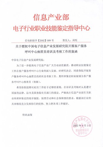 呼叫中心職業(yè)標準體系的主管單位為信息產(chǎn)業(yè)部電子行業(yè)職業(yè)技能鑒定指導(dǎo)中心;主辦單位為中國電子信息產(chǎn)業(yè)發(fā)展研究院職業(yè)技能培訓(xùn)部。