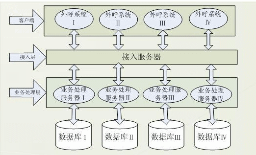 針對舊外呼業(yè)務系統(tǒng)的弊端及業(yè)務系統(tǒng)特點,賽迪呼叫研發(fā)了基于三層C/S結構的外呼業(yè)務系統(tǒng),該系統(tǒng)分客戶端,接入服務器,業(yè)務服務器及數(shù)據(jù)庫端?蛻舳税l(fā)送請求給分配服務器,接受到請求后,分配服務器根據(jù)客戶端的請求數(shù)據(jù)將其分配給自身的業(yè)務服務器做業(yè)務處理,這樣客戶端與業(yè)務服務器建立起聯(lián)系,結構體系如圖: