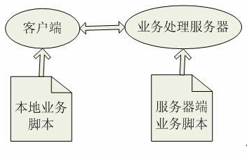 整個業(yè)務數(shù)據(jù)和業(yè)務處理都由XML配置管理,系統(tǒng)業(yè)務被分成本地業(yè)務邏輯和服務器端業(yè)務邏輯,客戶端通過提取本地業(yè)務邏輯腳本中的數(shù)據(jù)處理業(yè)務邏輯,業(yè)務處理服務器通過提取服務器端業(yè)務邏輯腳本中的數(shù)據(jù)訪問數(shù)據(jù)庫,并將數(shù)據(jù)庫返回結果發(fā)往客戶端。本地業(yè)務邏輯和服務器端業(yè)務邏輯之間的邏輯關系是通過一套配置腳本維護。如圖: