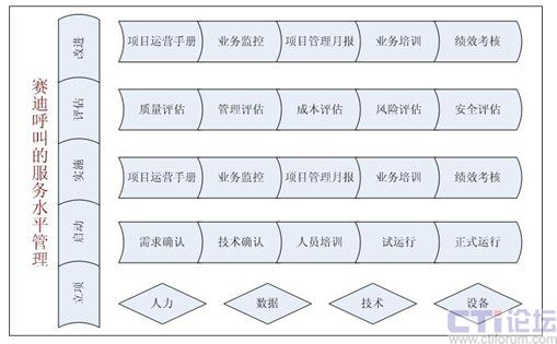 呼叫中心的服務(wù)水平管理通常包括以下一些內(nèi)容:    企業(yè)可根據(jù)自身特征、結(jié)合上述內(nèi)容,定義出符合自身呼叫中心屬性的服務(wù)水平管理內(nèi)容。以賽迪呼叫為例,作為一個(gè)外包型的呼叫中心,賽迪呼叫結(jié)合中國呼叫中心外包市場的特點(diǎn)及自身多年的行業(yè)經(jīng)驗(yàn),歸納出服務(wù)水平管理的五個(gè)步驟:立項(xiàng)、啟動(dòng)、實(shí)施、評估、改進(jìn),具體內(nèi)容如下: