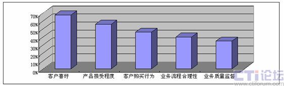 那么保險企業(yè)希望通過進一步深入開展電話中心信息化工作得到哪些效用或者有價值的信息呢,我們認為,電話中心為保險企業(yè)所提供的信息中最重要的依然是“客戶的聲音”,具體來說,包括客戶喜好和客戶購買行為等,其次便是業(yè)務流程信息。企業(yè)管理層對來自電話中心的不同信息的關注程度如下圖所示。