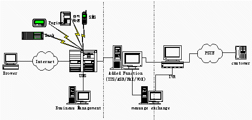 傳統(tǒng)UMS的分散的網(wǎng)民,而IVR, UMS服務(wù)提供商的客戶是企業(yè),系統(tǒng)的使用者則是企業(yè)的客戶(即系統(tǒng)面向下家,由下家為最終客戶提供服務(wù)),分離的模式可以有兩個(gè)獨(dú)立的企業(yè)來運(yùn)營系統(tǒng),IVR Service由具有電信資源的企業(yè)(如:具有接入號,有電信中繼資源,還有CTI系統(tǒng)建設(shè)經(jīng)驗(yàn))運(yùn)營。UMS Service由ISP企業(yè),網(wǎng)站門戶企業(yè)等在互聯(lián)網(wǎng)絡(luò)有建設(shè)經(jīng)驗(yàn)的企業(yè)運(yùn)營。兩家企業(yè)密切合作。共同提供完善的統(tǒng)一的信息服務(wù)。