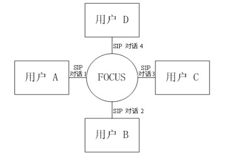 緊耦合會(huì)議的邏輯架構(gòu)圖如圖三所示。會(huì)議中的核心是"會(huì)議中心(conference focus)",每一個(gè)會(huì)議都有一個(gè)會(huì)議中心,由一個(gè)URI標(biāo)識(shí),用戶通過聯(lián)系這個(gè)URI參加到一個(gè)會(huì)議中去。會(huì)議中心和用戶之間的拓?fù)浣Y(jié)構(gòu)為星性結(jié)構(gòu)。會(huì)議中心為用戶提供并維持一個(gè)信令連接,并且可以執(zhí)行會(huì)議策略,實(shí)現(xiàn)對會(huì)議的控制和管理。