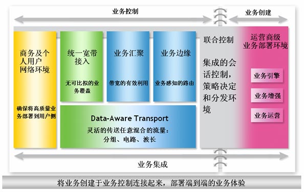首先,我們提供了智能的、具備業(yè)務(wù)感知能力的、安全的融合網(wǎng)絡(luò):這意味著通過(guò)安全的網(wǎng)絡(luò)將正確的業(yè)務(wù)部署到正確的客戶端,并保證最高體驗(yàn)質(zhì)量。它的本質(zhì)是在網(wǎng)絡(luò)的各個(gè)層面部署智能化和業(yè)務(wù)感知的元素,并實(shí)施完整的安全機(jī)制,正如我們前面提到的,業(yè)務(wù)演進(jìn)與網(wǎng)絡(luò)間相互有著緊密關(guān)聯(lián),為達(dá)到業(yè)務(wù)需求,網(wǎng)絡(luò)需要能夠根據(jù)業(yè)務(wù)進(jìn)行靈活調(diào)整。