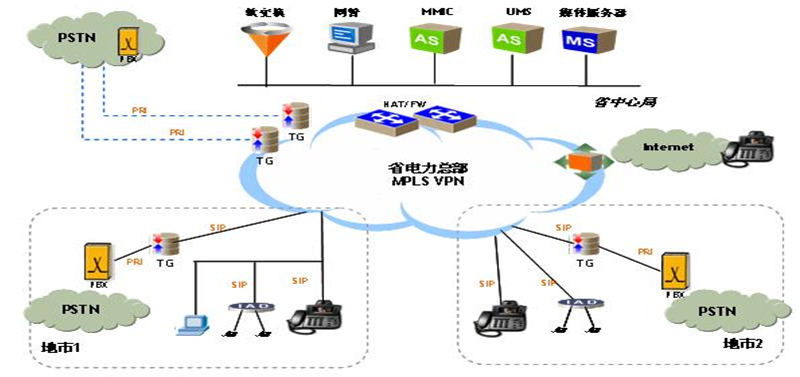 上海貝爾阿爾卡特的VoIP行業(yè)應(yīng)用解決方案可以幫助電力行業(yè)用戶提供可定制、可管理的VOIP增值業(yè)務(wù),包括IP Centrex、VPN、IP多媒體會(huì)議、Web 呼叫中心、一號(hào)通、Web800、統(tǒng)一消息、電子商務(wù)等多種業(yè)務(wù)。網(wǎng)絡(luò)拓?fù)鋱D如下:
