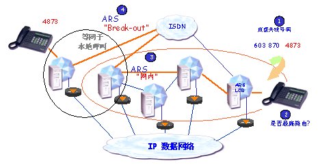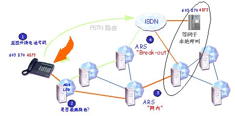 如果,一個網(wǎng)絡(luò)用戶想與一個外線用戶通話。ARS應(yīng)用程序分析所撥號碼。根據(jù)不同的呼叫方向,選擇最廉費用的運營商,而不管網(wǎng)絡(luò)內(nèi)的物理連接。地址信息將會被修改,從而符合該運營商的編號計劃(增加,刪除或轉(zhuǎn)換數(shù)字),并且被叫號碼和轉(zhuǎn)換后的號碼將會被存貯在呼叫詳細記錄(CDR)內(nèi)。