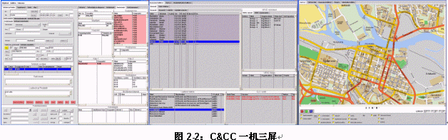 - 一機三屏:一屏CAD,另一屏為GIS,第三屏專用于資源調(diào)度。與雙屏配置相比,三屏配置的優(yōu)勢在與資源調(diào)度更加直接、快捷,同時更可以整合無線調(diào)度通訊資源。但是三屏配置需要較復雜的客戶化工作。