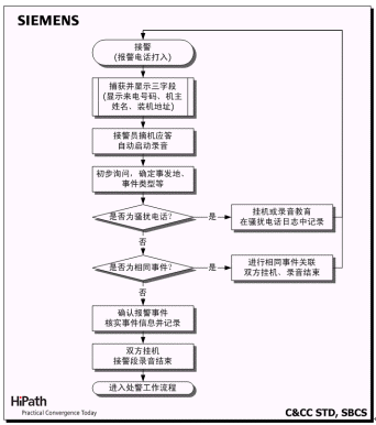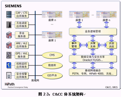 C&CC是西門子指揮控制中心全面解決方案的核心。C&CC以有線(HiPath 4000)/無線(模擬和數(shù)字集群)通訊平臺為信息采集和資源調(diào)度基礎(chǔ),系統(tǒng)核心模塊包括:融合多種業(yè)務(wù)的接處警工作流,面向地理信息對象的資源管理,面向事件的案情與錄音管理,基于預案的輔助決策支持,以及多種統(tǒng)計、查詢和報表生成工具等。在此基礎(chǔ)上,C&CC還提供豐富的接口,確保與技防報警、圖像/視頻監(jiān)控和GPS