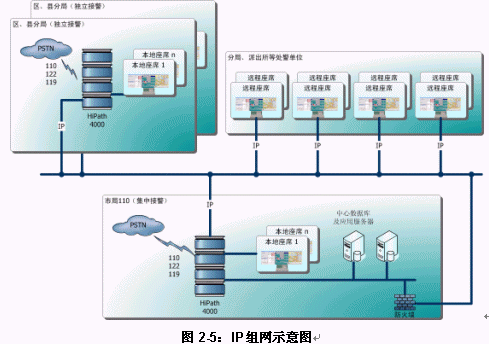 圖 2-5給出了使用純IP實施城市110組網(wǎng)的最普遍的示意。從該圖可以看出,無論采用集中接警還是分散處警,C&CC特別使用于使用純IP技術(shù)實施全市(包括所轄縣級市)110組網(wǎng)?紤]到目前全國公安二、三、四級網(wǎng)建設(shè)日漸成熟,使用純IP技術(shù)實施全市110組網(wǎng)并實現(xiàn)"三警合一"確實是經(jīng)濟、靈活而方便的選擇,前文提到的芬蘭112全國組網(wǎng)使用的也是這樣的技術(shù)。當然,現(xiàn)存的傳統(tǒng)公安通訊專網(wǎng)仍然可以作為備份話務(wù)路由存在。