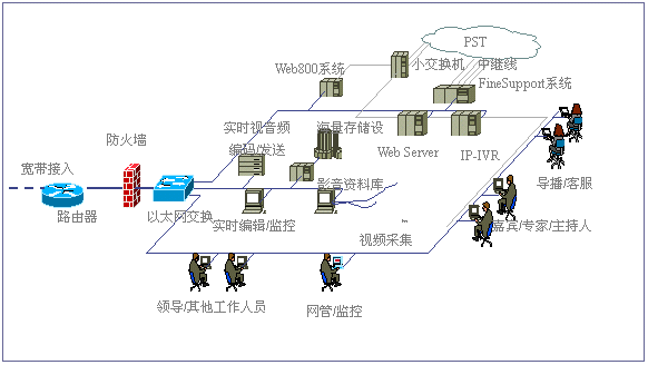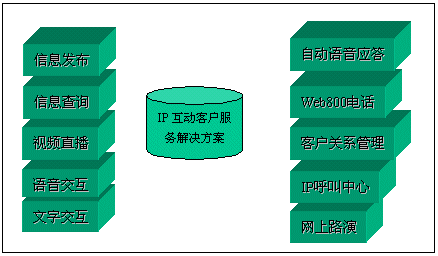經(jīng)過對比分析,我們發(fā)現(xiàn),目前國際國內(nèi)市場上很多客戶服務(wù)產(chǎn)品,大都僅僅完成客戶服務(wù)的一部分。北極星“IP互動客戶服務(wù)中心解決方案”則引入互動客戶服務(wù)(ICS:Interactive Customer Service)系統(tǒng)以及數(shù)碼互動直播的概念,形成了由視頻點(diǎn)播、網(wǎng)上路演、語音和文字交互、IP客戶服務(wù)中心、Web800語音電話、實(shí)時服務(wù)中心、專家實(shí)時在線、客戶關(guān)系管理、在線尋呼系統(tǒng)和客戶社區(qū)服務(wù)系統(tǒng)等全方位的服務(wù)內(nèi)容。該方案主要基于IP架構(gòu),系統(tǒng)擴(kuò)展性非常靈活,系統(tǒng)體現(xiàn)的客戶服務(wù)思想非常能夠滿足我們的需求。2001年3月,經(jīng)過一段時間的試運(yùn)行后,我們正式推出了這套“IP互動客戶服務(wù)”系統(tǒng)。