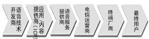 語音互聯(lián)網(wǎng)將最終形成由語音技術(shù)開發(fā)商-應(yīng)用/內(nèi)容提供商-語音服務(wù)提供商-電信運營商-終端廠商組成的產(chǎn)業(yè)價值鏈(見圖2)。