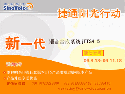 為慶祝jTTS4.5的上市,同時(shí)也為回饋廣大用戶,捷通華聲進(jìn)行為期三個月的推新品“陽光行動”!詳情敬請瀏覽:http://www.sinovoice.com.cn/xwzx/20060818.htm