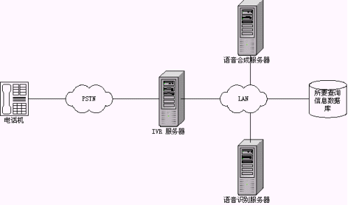 這種模式是最常見的一種接入情況。將原有煩瑣的按鍵式提示改成更具人性化的交談式語音交互,類似于語音門戶模式。這是目前大家普遍認(rèn)同的一種語音識別技術(shù)應(yīng)用方式。相比原有的按鍵方式,系統(tǒng)的新穎程度、個性化程度、用戶操作的方便程度等都得到了極大的提高,如語音識別技術(shù)在股票查詢中的成功應(yīng)用,在點(diǎn)歌系統(tǒng)中的成功應(yīng)用等;另外利用語音識別技術(shù)也解決了一些原有系統(tǒng)無法實(shí)現(xiàn)的技術(shù)難題,如火車時刻查詢、機(jī)場航班查詢等,原有系統(tǒng)借助郵政編碼、電話區(qū)號等的方式讓人無所適從,現(xiàn)在直接和系統(tǒng)交談,順利獲取所需信息,可以說是語音識別技術(shù)一個成功的應(yīng)用。這種系統(tǒng)的拓?fù)浣Y(jié)構(gòu)如下圖示: