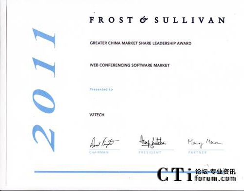 CTI論壇(ctiforum)1月12日消息(記者 浩宇):全球領先的Web會議解決方案供應商V2威速宣布,榮獲全球領先咨詢公司Frost&Sullivan頒發(fā)的“大中華區(qū)Web軟件會議市場份額領導者”殊榮。Frost & Sullivan設立該獎項旨在表彰各個行業(yè)領域在過去一年業(yè)績表現(xiàn)最佳并占有最高市場份額的企業(yè)。