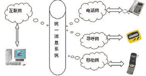UMS可以將電子郵件、語(yǔ)音、尋呼、移動(dòng)短消息、傳真和多媒體數(shù)據(jù)等所有信息類(lèi)型集合為一個(gè)信息,并可用電話、傳真、手機(jī)、呼機(jī)、PC、掌上電腦、PDA等通信設(shè)備中的任何一種接收,在有線、無(wú)線、互聯(lián)網(wǎng)之間架構(gòu)起一個(gè)信息互聯(lián)通道(如圖)。統(tǒng)一信息系統(tǒng)(Unified
