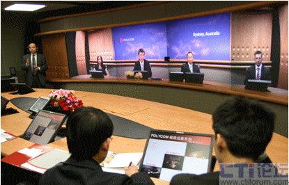 我們參與體驗(yàn)的8個(gè)人在面向屏幕的一側(cè)坐下,寶利通技術(shù)人員在位于會(huì)議桌正中的觸摸屏上輕輕點(diǎn)了一下,對(duì)面瞬間出現(xiàn)了4張微笑的面孔,整個(gè)畫面的色彩和亮度都非常柔和,感覺對(duì)面的座位突然間被坐滿了。技術(shù)人員介紹說我們已經(jīng)和澳大利亞辦公室接通了,我仔細(xì)觀察才發(fā)現(xiàn),除了背景墻上的“Sydney,